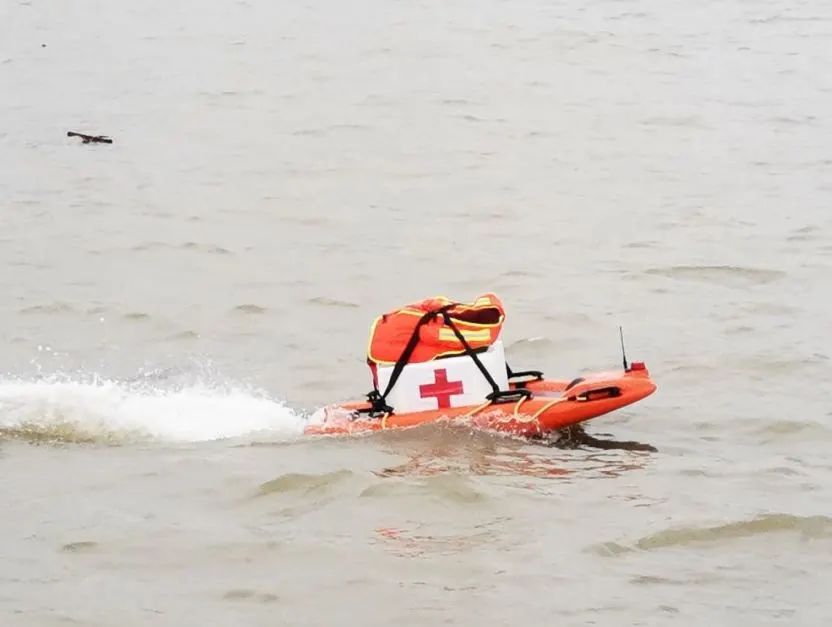 “水上飞”打开警灯和警笛作为救援提示,携带多个绳子联结的救生圈,行驶到翻船处。落水者各抓取一个救生圈后返航。