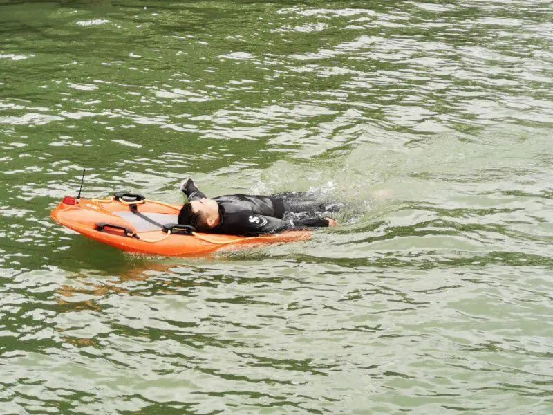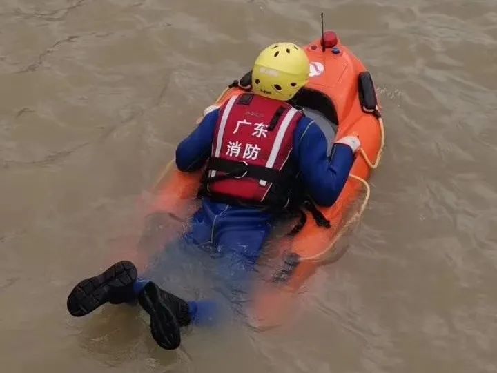 警员趴伏“水上飞”上,行驶到落水者身旁,将其绑缚拉回岸边,通过 “一拖一”方法并对落水者进行强制救治。