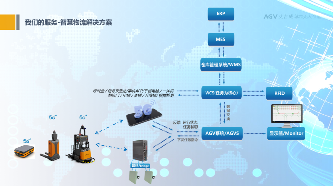 5G促使智慧工厂系统串联,工业生产各个关联系统的孤立模式将被打破。艾吉威机器人可基于5G技术提供的AGV无人仓运解决方案,其调度系统AGVS可与ERP、MES等生产管理系统无缝对接;为优化库位管存、第三方外围设施(自动门、电梯)的融合,艾吉威推出WMS(库位管理系统)、WCS(仓库控制系统),为客户打造工业生产物流信息闭环式管控,智慧工厂数据链互通,实现AGV业务无断层无隔阂。基于5G+工业互联网、5G+无人驾驶等发展需求,加载5G技术的移动搬运机器人正在被大力开发。近日,移动搬运机器人AGV领军企业苏州艾吉威机器人有限公司与中国联合网络通信有限公司苏州分公司签订战略合作协议,共建5G联合实验室,双方将充分发挥各自优势,推动新一轮创新产业和5G+AGV服务领域的融合创新。