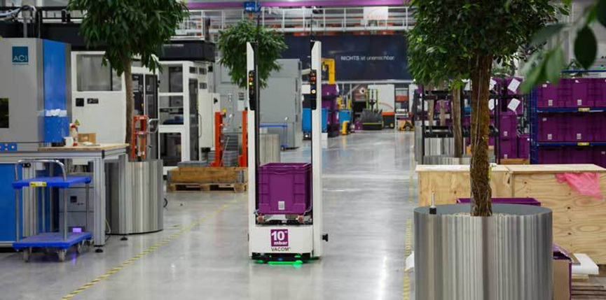 在VACOM现代化的“智能工厂”中,五个proANT-L型运输机器人以及一个自动导航的托盘车proANT 576在运转,确保了工厂物料流。这些车辆连接到制造执行系统(MES),仓库管理系统(WMS)和SAP。这样就可以对所有生产步骤以及及时的运输交付进行透明的监视和记录。