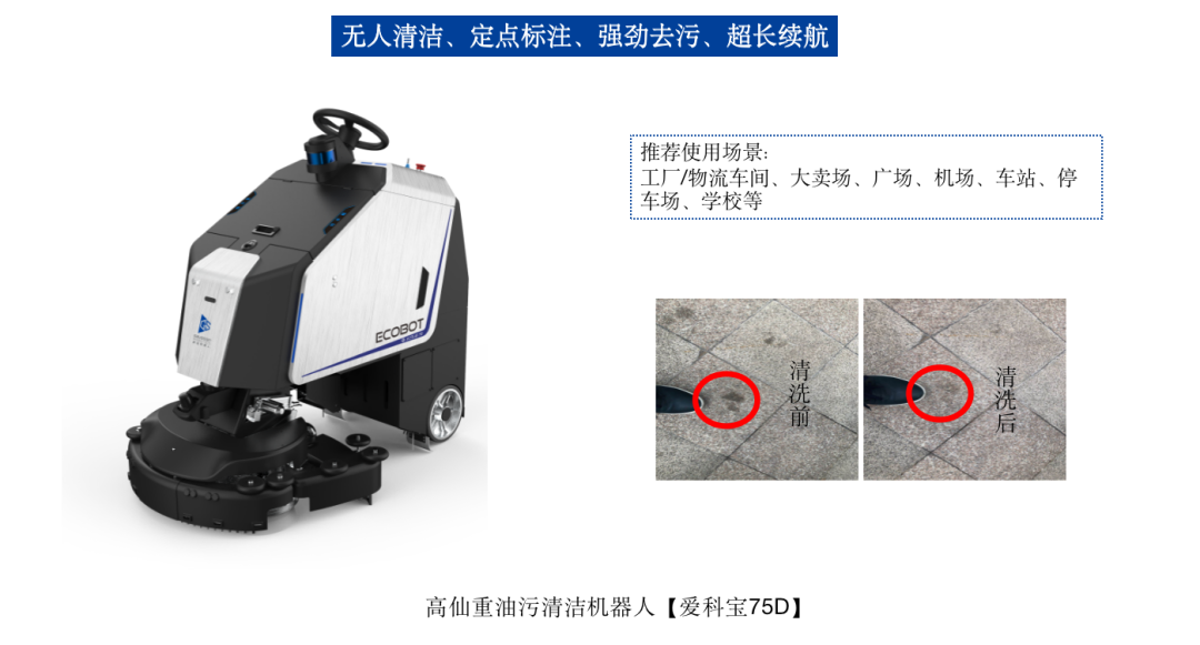 这批高仙机器人“清洁工”除了能够针对室外广场及室内大场景进行常规洗地、推尘、消毒外,还能够针对沉积油污进行深度清洁,效率效果是传统清洁手段的5倍以上,并可以实现全程的无人监管,属于业内的独创性产品。