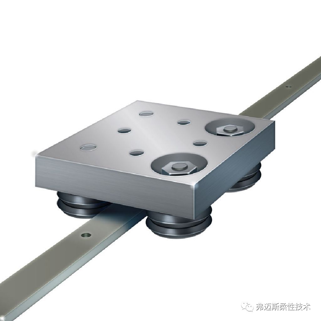 环形导轨可集成到客户的设备或框架结构中,轨道可以是椭圆或矩形,承载滑座驱动可采用连续或分度运动的方式,导轨采用了久经验证的V形轨道原理,可承载更高负荷,使用寿命长、维护要求低,在恶劣环境中有着出色的表现。环形导轨的精度可实现±0.05mm的可重复定位,一个很重要的精度指标是V型面的V型尖和导轨底面之间的距离容许误差为±0.025mm,V型导轨采用了精密的研磨加工工艺,和滚轮圆弧导轨配合的滚轮可采用精密滚轮,滚轮的安装高度容许误差为0.02mm。精密滚轮安装到铣过的滑座板上,滑座板和导轨间的安装高度就得到了精密的控制。