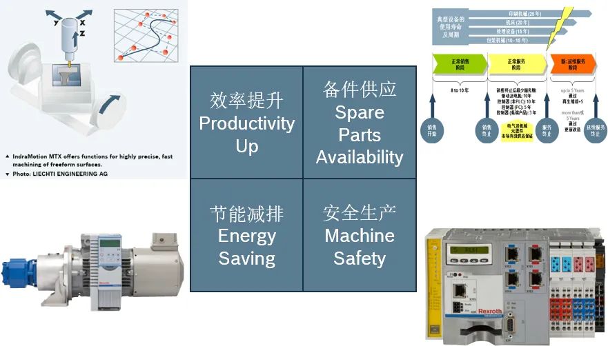 对于那些即将面临或已经服务淘汰的产品,如以上的DIAX和EcoDrive系列产品,我们在再生维修基础上推出了再生维修+5的方案,即在再生维修服务后提供额外的5年维修及备件有效服务。这样避免了客户费时费力寻维修及备件的问题,使设备发生故障后可以迅速恢复到可靠的生产状态。