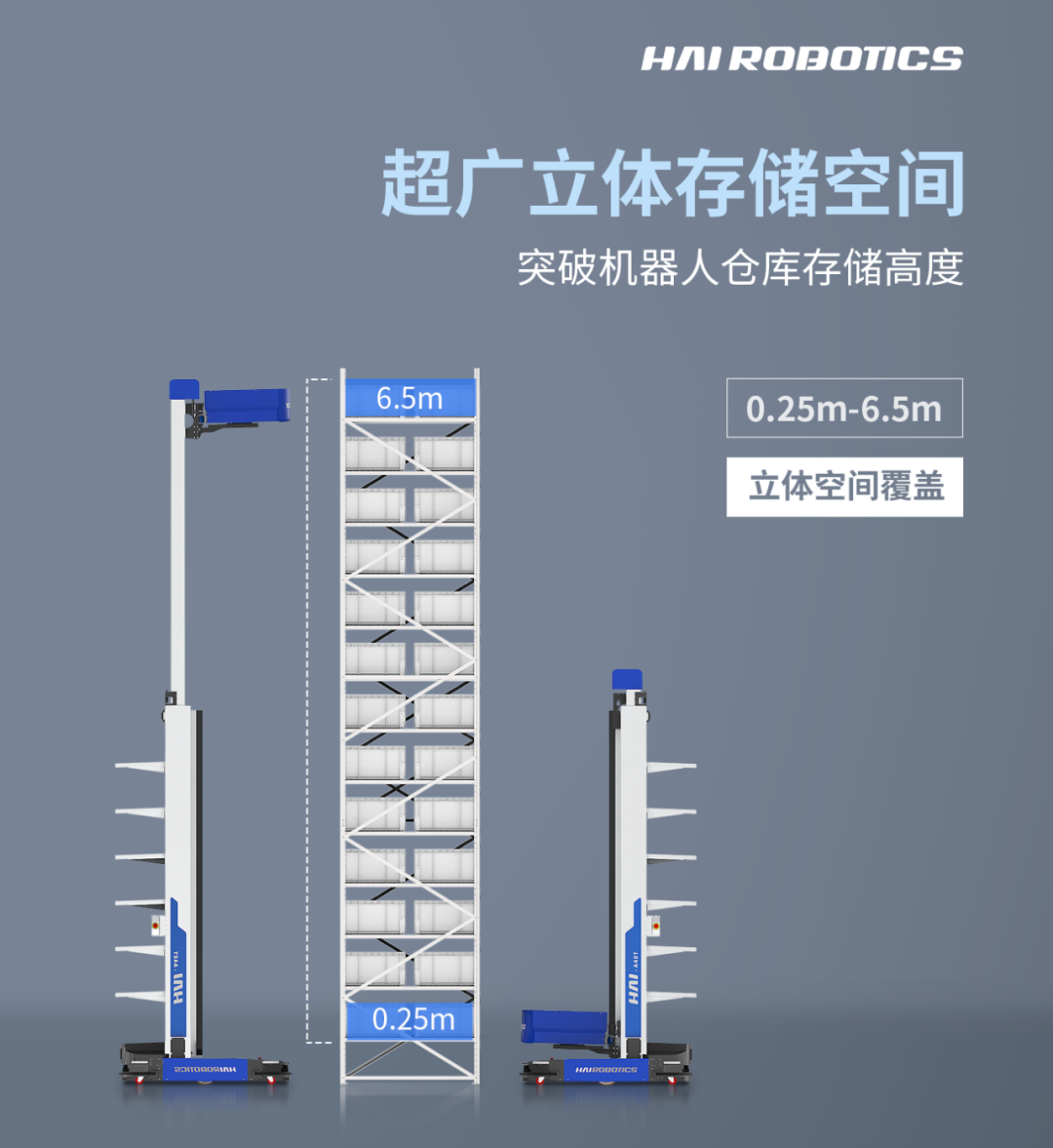 库宝HAIPICK A42T再次突破机器人仓库存储高度,机器人最低存取范围低至0.25m,最高可达6.5m,实现超广立体空间覆盖,提升存储密度。