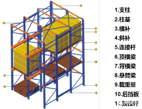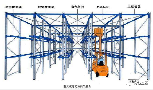 驶入式货架的主要组成部分:立柱片、连接杆、牛腿 、牛腿梁 、顶拉杆、 背拉杆、 护柱。