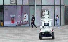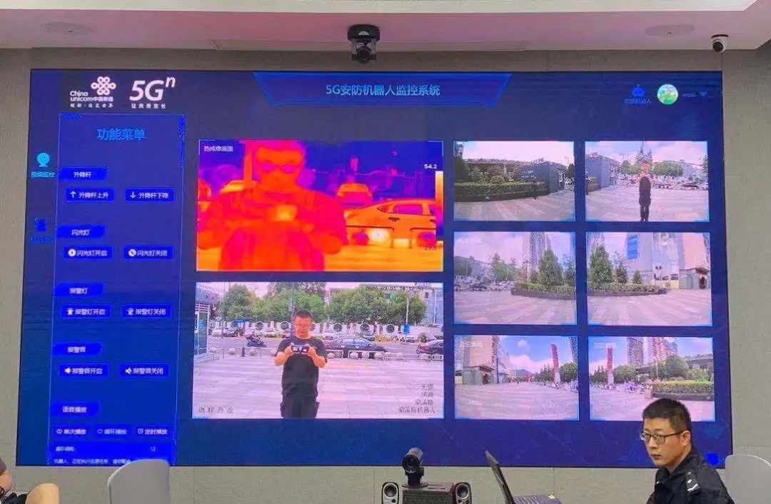 5G+人工智能巡逻机器人高度1.6米,搭载6个高清摄像头,可以进行360度的旋转和上下120度俯仰,实现全方位安防巡逻,同时它还具备红外温度感知功能,即使夜间也能开展视频巡逻,机身还设置了“报警”按钮,遇到紧急情况的市民可以通过该按钮实现一键报警。