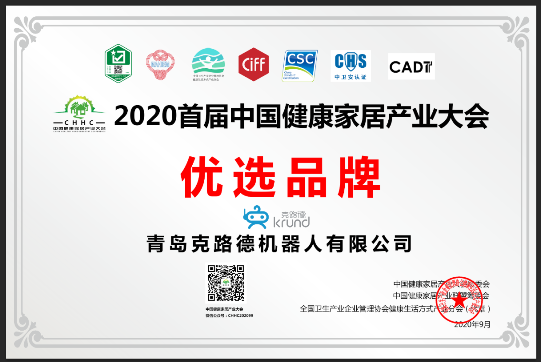 9月9日,在首届中国健康家居产业大会上,为表彰克路德在常态化疫情防控和健康家居产业上做出的突出贡献,为行业各方树立优良典范,大会主办方“全国卫生产业企业管理协会会展活动管理部、全国卫生产业企业管理协会健康生活方式产业分会、中国家博会(上海)、中国健康家居产业联盟筹委会”授予克路德“健康家居优选品牌”奖项。
