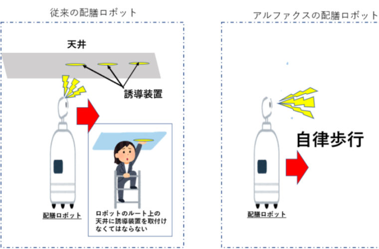 以往的送餐机器人多是在天花板上安装步行引导标签,沿着天花板设置的传感器的路线步行的方式,这使安装变得复杂,并且给安装工作带来了成本负担等。