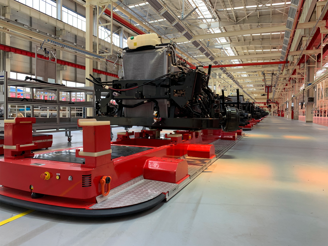在 “超级试验工厂”中,CSG华晓为其量身定制由近百台AGV组成的解决方案,实现了装配及物料输送的柔性化,有效提升了物料运送、移载等工作的速度和效率,同时减少人工运输可能产生的物料损坏,极大地提升了重卡的智能制造水平。