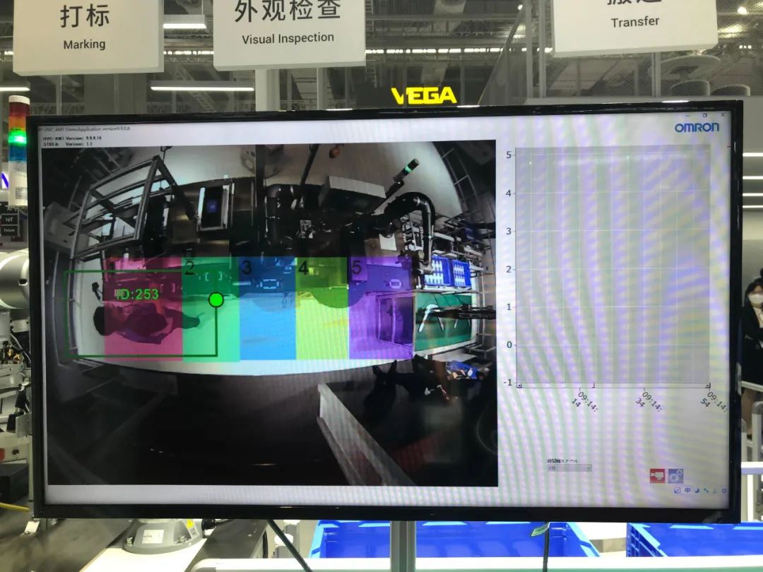 通过5个色块分别显示5道工序的作业状态,监测作业人员的移动以及每道工序的停留时间,来判断作业是否正确,是否有待机时间等。