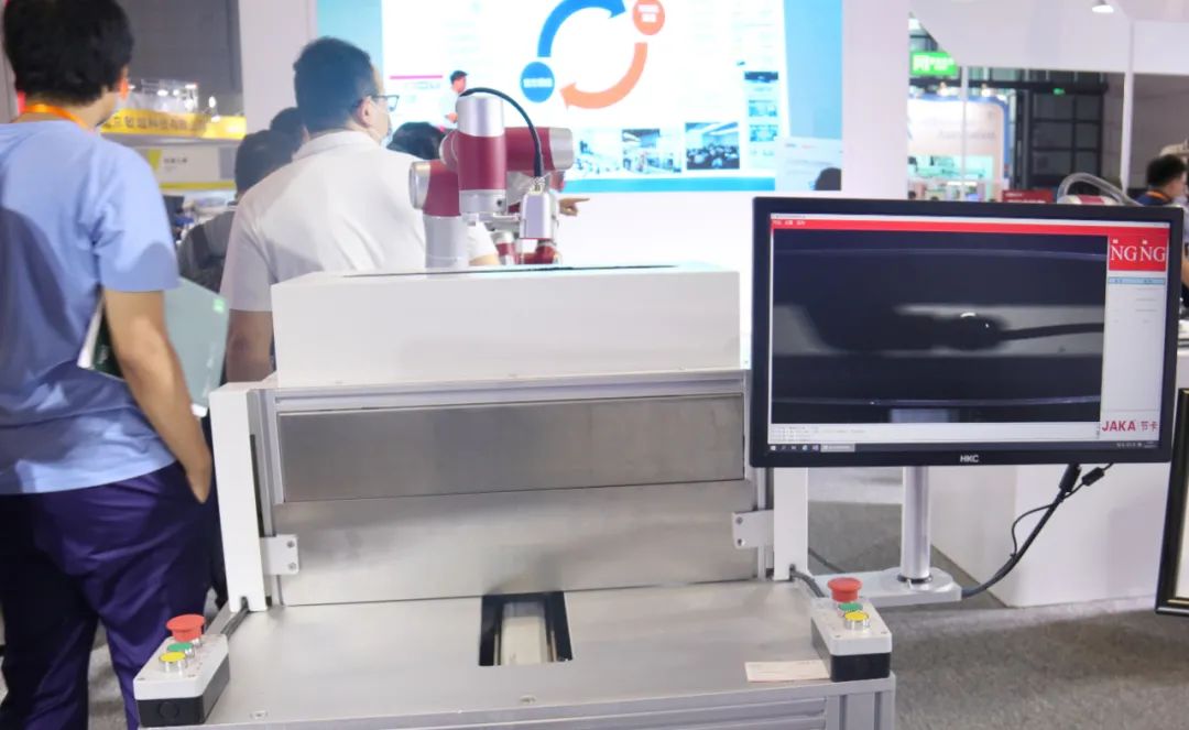 3D视觉分拣:将3D相机装在机器人末端, 对杂乱无章的物体进行三维定位和抓取,帮助用户解决实际的3D视觉需求。其中应用在手机领域PCB检测、搬运、新能源行业后包装段锂电池工作站、汽车行业光导条检测、食品搬运码垛、移动复合机器人等吸引参观者的目光。除此之外,主从联动、力控拖拽和轨迹复现、针对复杂曲面的轨迹示教的离线编程体验、节卡机器人自主研发的JAKA视觉防护系统,以及对商业服务具有重要意义的机器人摄影、无人咖啡机也是展会流量担当。