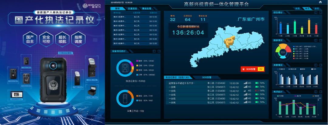 随着国家自主可控战略的不断推进,高新兴推出了首款国产八核E5执法记录仪,不仅在自主创新上有所突破、性能也极其强大,可在治安巡逻、缉查布控、应急指挥等应用场景使用。高新兴执法视音频管理平台实现对所有执法视音频数据的统一管理,可与六合一、警综、执法办案等平台的数据关联比对,全面赋能实战应用,产品已在全国23个省、300个地市级执法单位应用。
