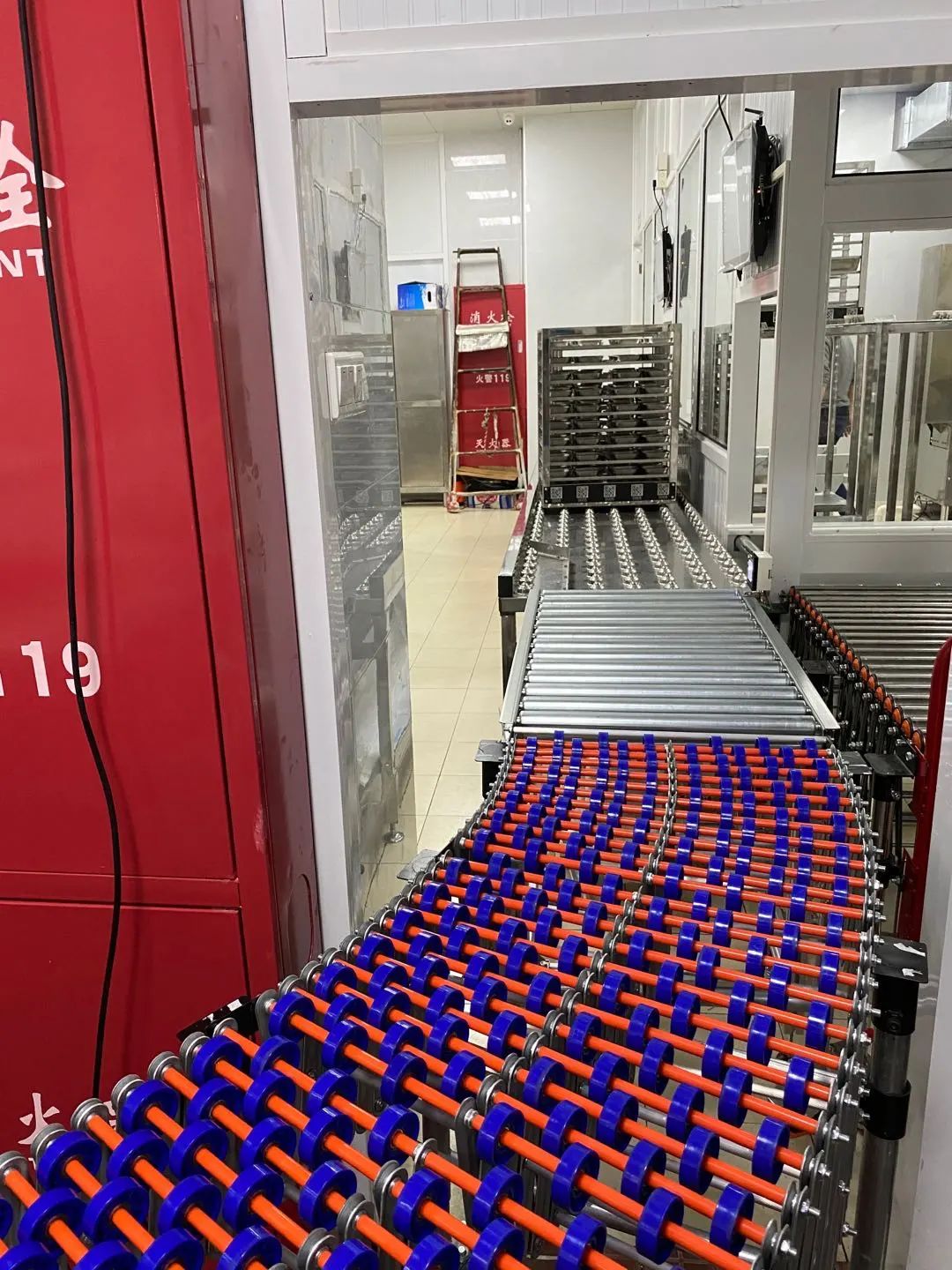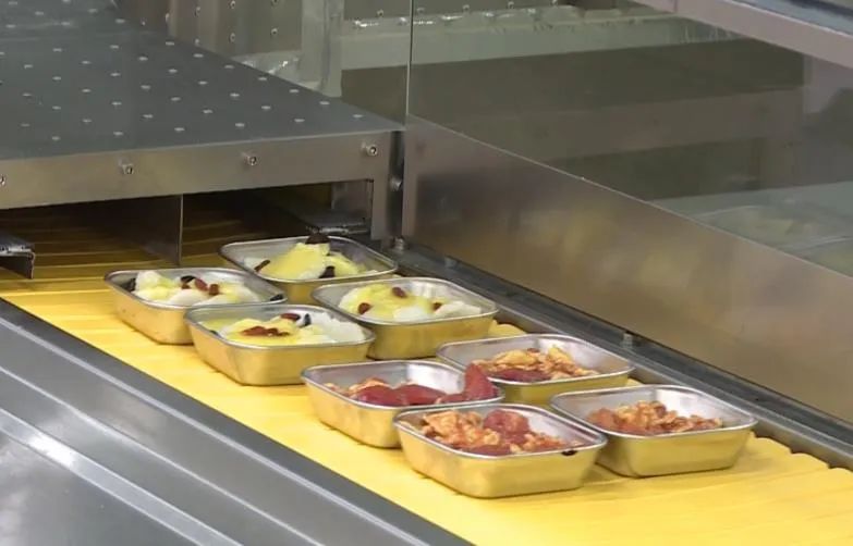 食物层架到了指定地点,“机器人阿姨”便会将其顺畅地“转移”至传输带对面的烹饪箱中。据了解,“阿姨”每次操作可搬运72盒菜品,在1个半小时内,可完成学校1000余人的用餐需求。