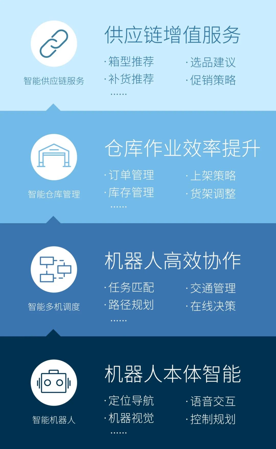 极智嘉通过积累大量的业务运营数据和经验,构建和打磨了业界领先的完整AI算法体系,从机器人本体智能到多机器人群体协同,从仓库作业运营到供应链增值服务,覆盖智慧物流业务全流程/全场景,为客户供应链效率提升提供强有力的支撑。