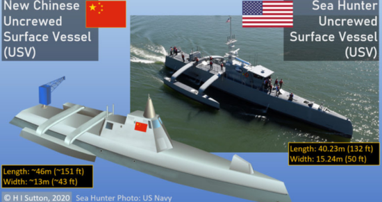 报道称,由于速度更高、核动力潜艇可能会超过无人水面舰艇的速度。日本、澳大利亚和印度目前都装备了柴电潜艇,而中国研制这艘军舰的目的很可能是对抗他们的柴电潜艇。此外,从目前曝光的照片来看,虽然中国研制的无人战舰外形与美国相似,但中国的无人战舰比美国长,排水量也较大。目前,这艘战舰的详细信息极少,尚不清楚是政府投资还是私人投资,但该舰正在江西九江长江岸边的一家造船厂制造。中国公司已经推出了几款无人水面舰艇,其中包括武装型号,例如2017年在中国海洋经济博览会上首次亮相的Tianxing-1,它使用刚性充气船船体,并且配有机枪,约为12.7毫米。还有JARI双体船,装备了30毫米火炮,地对空导弹和两枚反潜鱼雷。不过,这两种无人船舶的大小都不及现在这款新型三体USV。