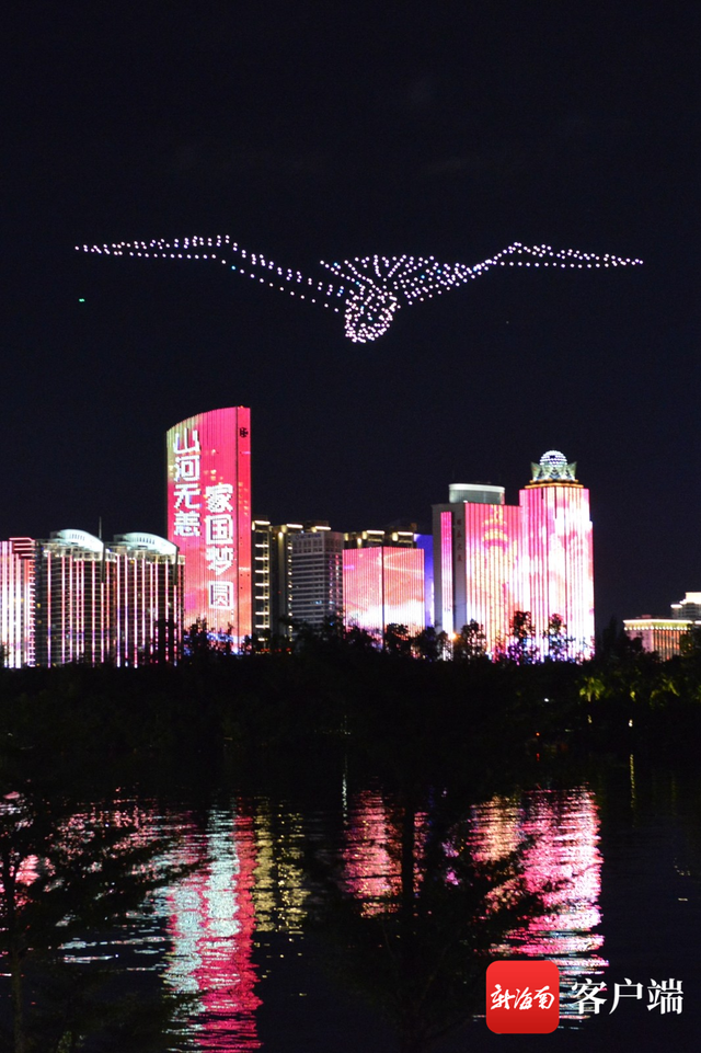 10月3日晚,400架无人机在海口万绿园上空画出了航天飞机、海鸥、世纪桥、花朵等图案,还写出“奋进自贸,不负韶华”等字样,为节日的海口夜空画出最美画卷。