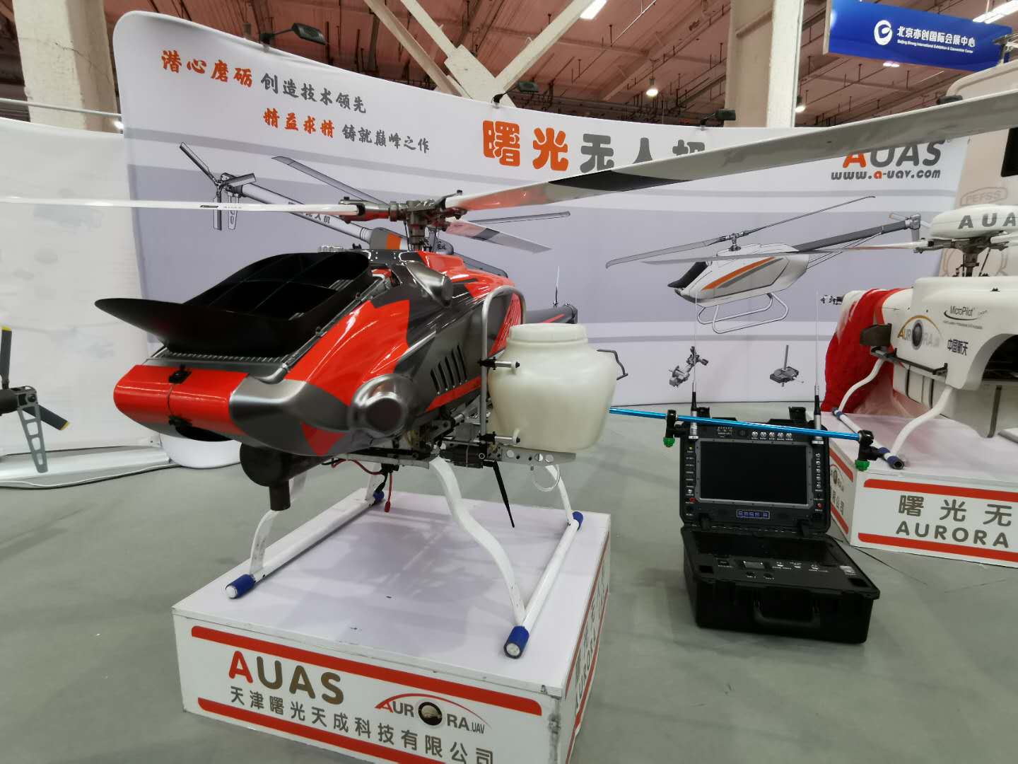 10月13-15日,“2020全球无人机应用及防控大会“在北京亦创国际会展中心正式举行。来自天津曙光天成科技有限公司(以下简称:曙光无人机)携曙光5A-01无人直升机、无人机装备测试车、以及油动植保机亮相展会。