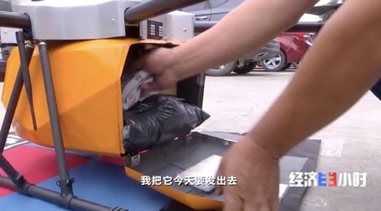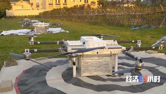 在距离安吉县300多公里外的舟山群岛,《经济半小时》记者记录了一场无人机带货测试。代号为“方舟七零”的一个无人机,轴距两米五,货舱6.3升,最大载重量10公斤,有8只螺旋桨,装有4块电池。