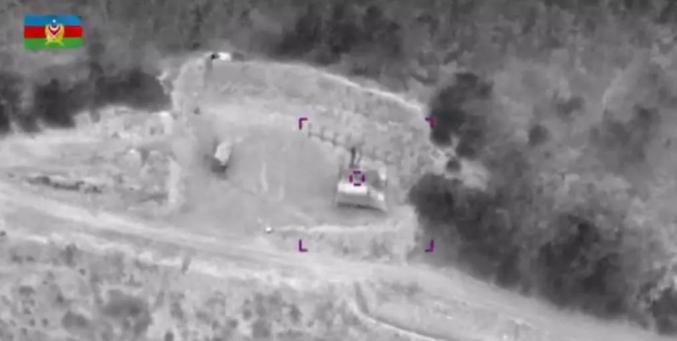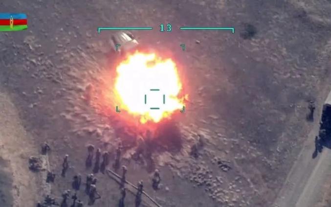 从媒体报道看,在冲突爆发的第一时间,阿塞拜疆军队就将大量无人机投入作战,在前线展开积极行动。根据阿塞拜疆国防部发布的公报,阿军的步兵和坦克部队在己方火炮、导弹、前线飞机和无人机的支援下,侦察并摧毁了前沿地带及纵深的亚美尼亚部队、军事设施和武器装备,并宣称已经击毁了12部“黄蜂”防空导弹;后来发布了冲突以来第一段关于无人机精确打击的视频影像,标题为“敌人的军事装备被摧毁”,从视频可见受到攻击的是亚美尼亚防空导弹阵地,“黄峰”防空系统制导雷达正在运转,但未能对无人机袭击做出任何反应,这段影像应该是从监视战场的另一架无人机上拍摄的。