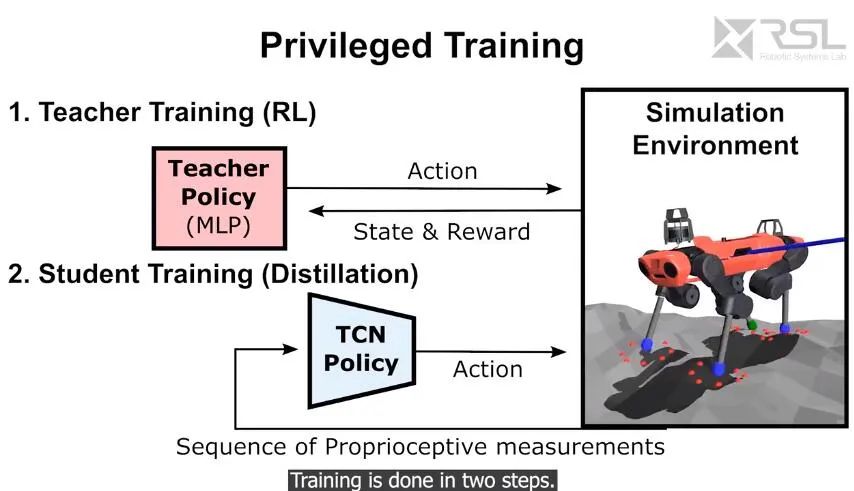实现优化结果的第二个关键在于特权学习(privileged learning),研究人员发现直接通过强化学习训练出的越野运动策略并不成功:控制信号稀疏,并且所输出的网络无法在合理的时间内学习出正确的运动。新的模型在训练中分为两个阶段,首先训练教师策略,该策略可访问特权信息——真实情况(ground-truth)及机器人接触的情况,随后教师指导纯本体感受的学生控制器学习,后者仅使用机器人本身可用的传感器信息。这种特权学习会在模拟环境中启用,但最终学习到的策略可以在模拟环境,以及真实的物理环境中部署。