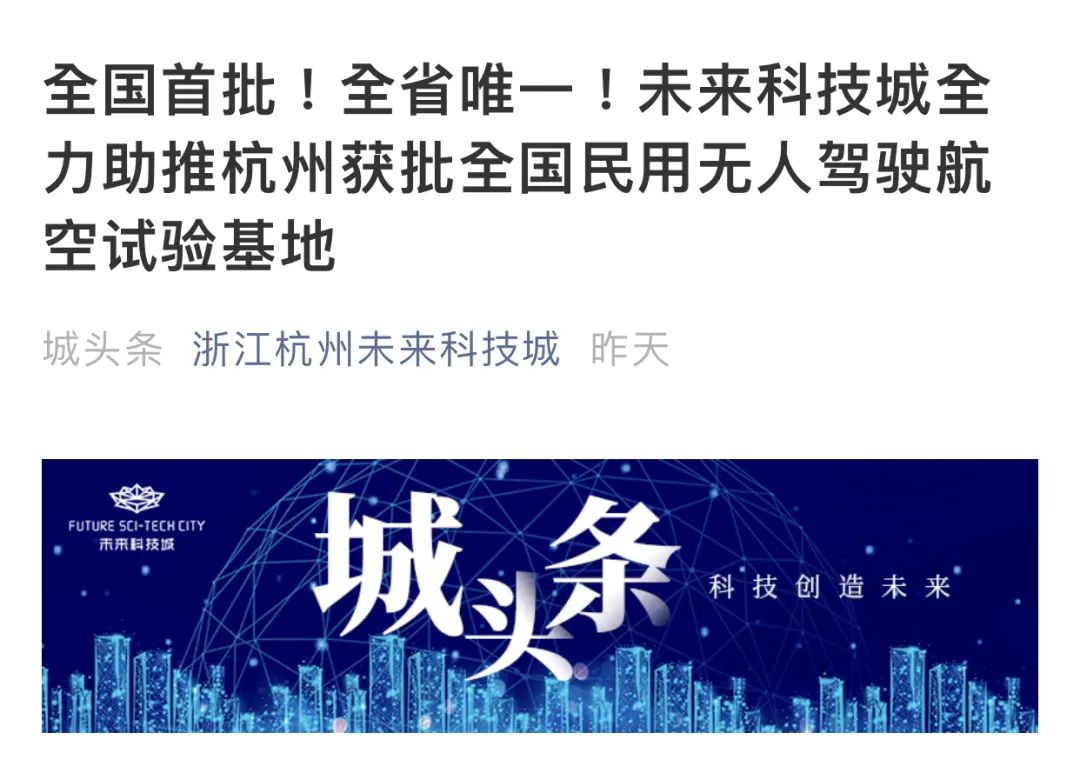 根据民航局公布的首批民用无人驾驶航空试验基地(试验区)名单,杭州市经预审、答辩及实地考察三个环节的综合论证,成功从50余个直辖市、副省级城市、地级市(区)中脱颖而出,成为我国首批民用无人驾驶航空试验基地(试验区),未来科技城为试验区核心区。