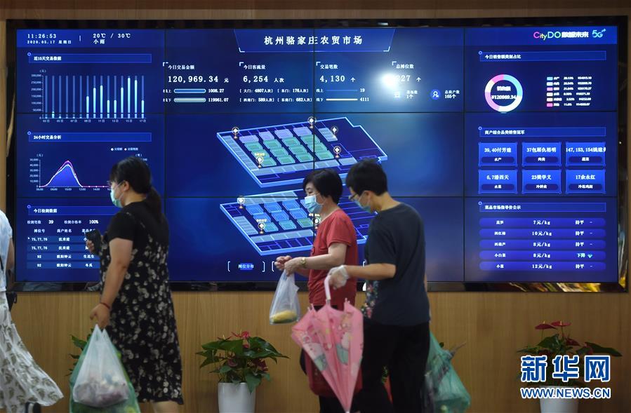 浙江省杭州市的5G农贸市场——骆家庄农贸市场的大屏幕上实时显示交易、客流等相关情况(5月17日摄)。新华社记者 韩传号 摄