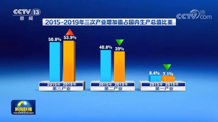 从“十二五”末的2015年到2019年,第三产业增加值占国内生产总值的比重从50.8%增加到了53.9%,与此同时,第二产业增加值的比重下降到39%,第一产业增加值的比重下降到7.1%。我国经济结构日益优化,发展方式从规模速度型转向质量效率型,发展动力从主要依靠资源和劳动力等要素的投入,转向创新驱动,产业融合速度不断加快。
