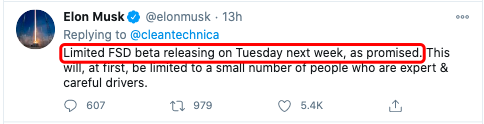 7月22日,在特斯拉股东电话会议上,马斯克表示:「我对年底推出的完全自动驾驶功能充满信心。」8月14日,马斯克在Twitter上提到FSD的基础架构重写,并透露新的版本将在「在6到10周内有限公开发行」。9月12日,马斯克在Twitter上宣布:「在2至4周内发布私人测试版,然后在4至6周内发布公开测试版(选择加入的早期访问用户),然后是12月中旬所有美国特斯拉所有者。超出计划取决于未遇到重大的意外挫折。」