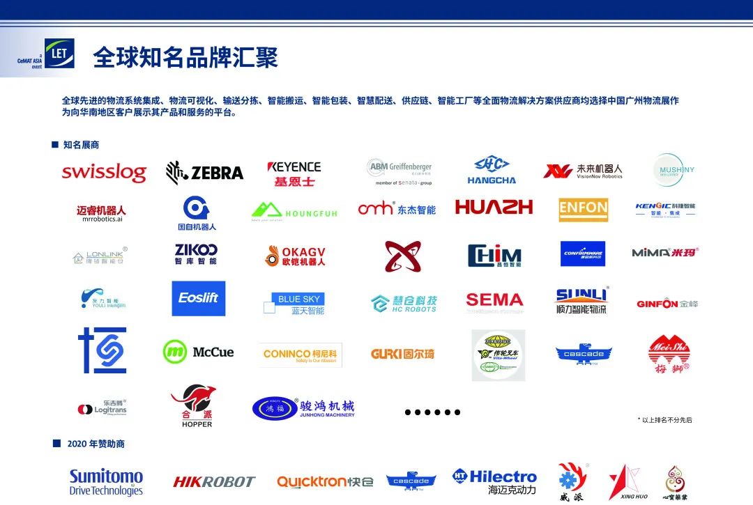 全球先进的物流系统集成、物流可视化、输送分拣、智能搬运、智能包装、智慧配送、供应链、智能工厂等全面物流解决方案供应商均选择汉诺威LET中国广州物流展作为向华南地区客户展示其产品和服务的平台。
