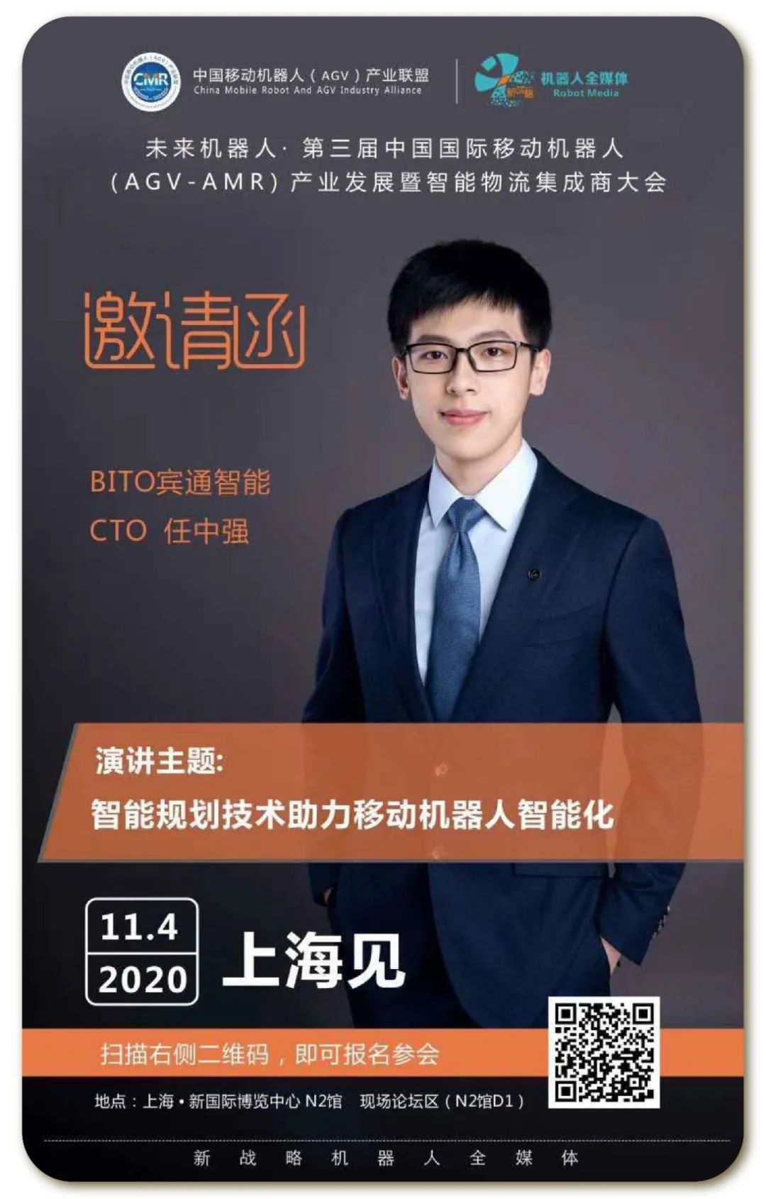 届时BITO CTO任中强先生将受邀参加同期举办的第三届中国移动机器人(AGV-AMR)产业发展暨智能物流集成商大会,并现场分享“智能规划技术助力移动机器人智能化”的主题演讲,有兴趣的伙伴们还不赶紧扫码报名!