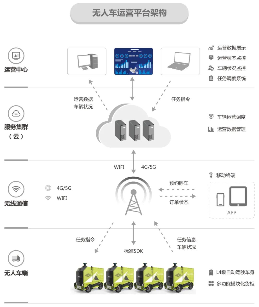 ●绝地系列配有行深智能自主开发的车辆后台管理系统、后台监控系统及车辆管理小程序,支持车端监控实时上传、车辆状态主动上报、电量不足自主返航等功能,运营管理实现可视可控。同时,绝地系列无人车也支持5G通讯,满足各类服务数据高质回传需求,同时可自动向下兼容4G模式,确保5G信号缺失情况下车体设备的正常运行。管理便捷、配置丰富、功能扩展性强,满足客户轻量化运营需求。