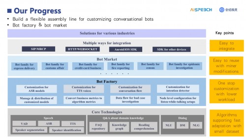 在这条流水线上,用户如同置身一个机器人工厂,可以基于思必驰自主研发的全链路语音语言技术,精细化、可视化、场景化、规模化的完成定制,包括对话流程定制、语义定制、知识定制、语音识别模型定制、音色定制以及机器人优化。机器人工厂将所有关键模块集成起来,提供一站式的定制能力,显著的提升了对话机器人定制的效果和效率。