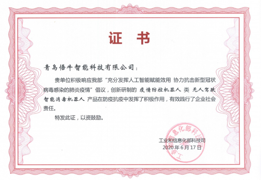 2020春节期间,为抗击疫情,凭借扎实的无人驾驶技术,悟牛智能紧急研发改装无人驾驶消毒机器人并进行无偿捐赠,以最快速度部署至山东省数家疫情防控医疗机构及青岛流亭机场,成为国内首家进入医院隔离区部署无人驾驶消毒机器人的人工智能公司,以高新科技的力量为打赢疫情战贡献绵薄之力,得到社会各界的高度认可,并屡获新华社、人民日报、中国日报等权威媒体报道及工信部等部委嘉奖。