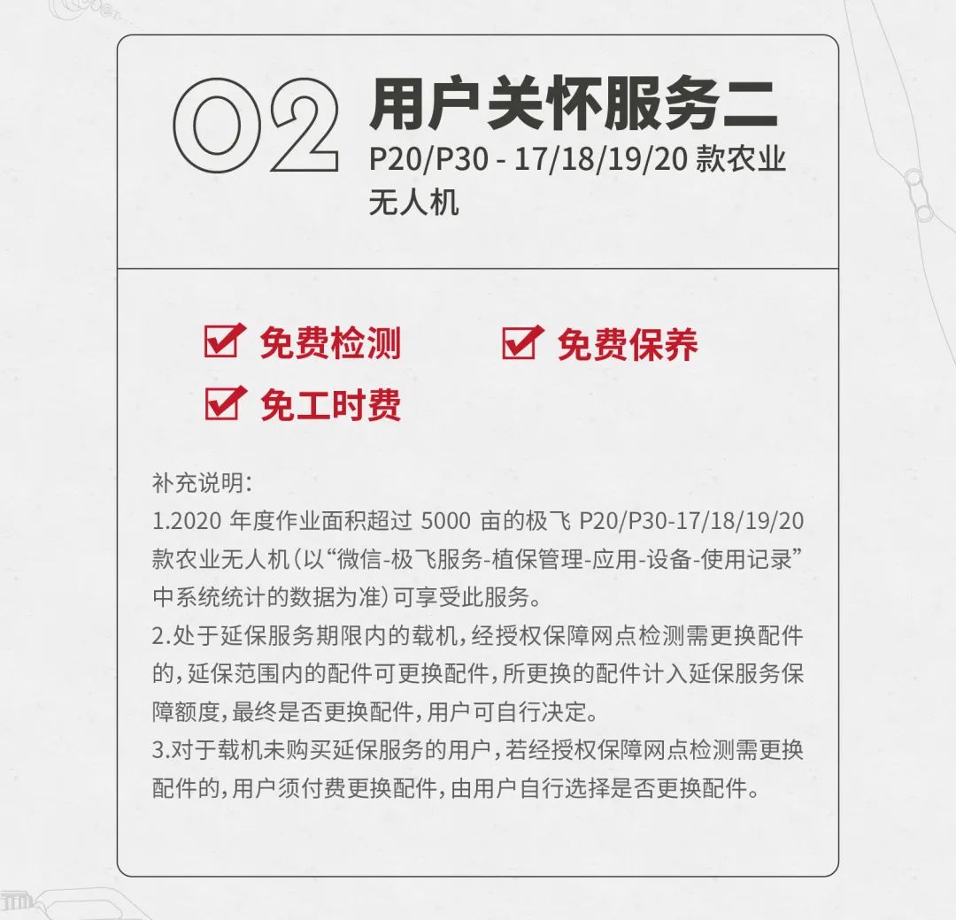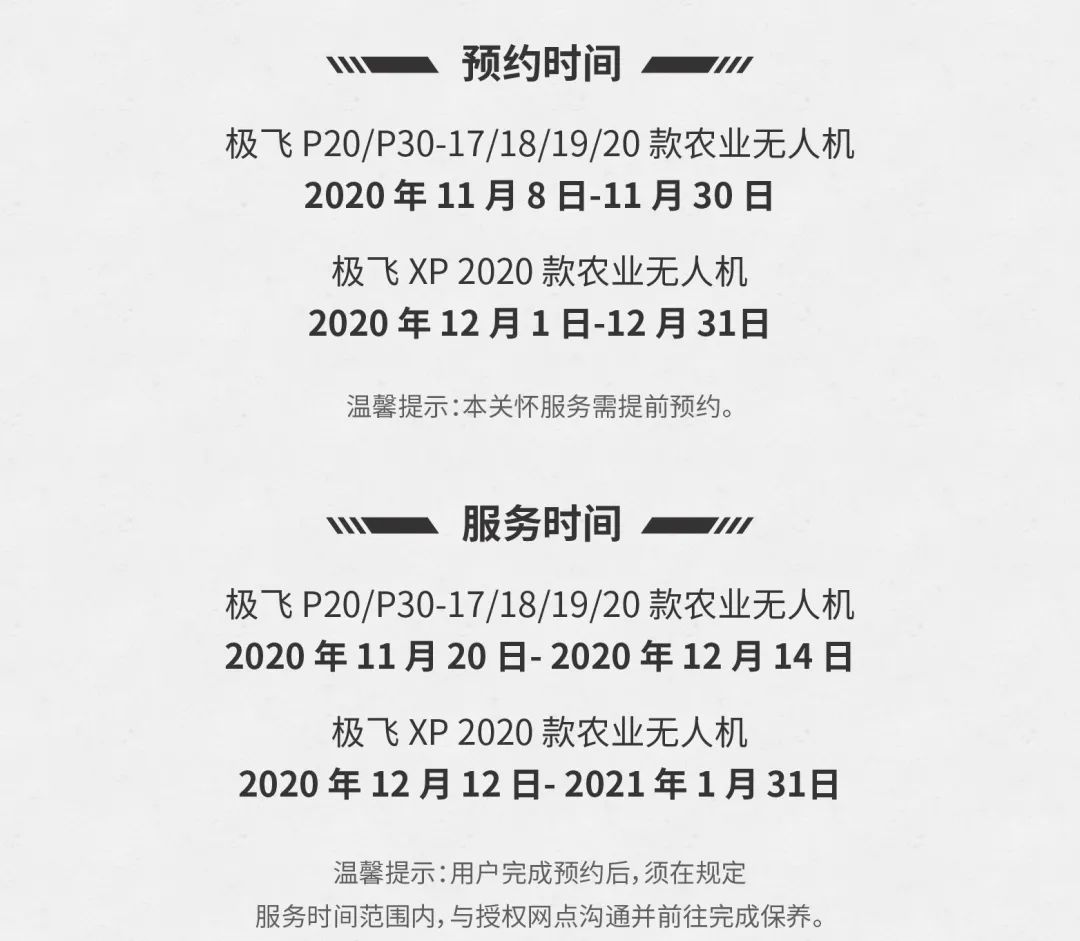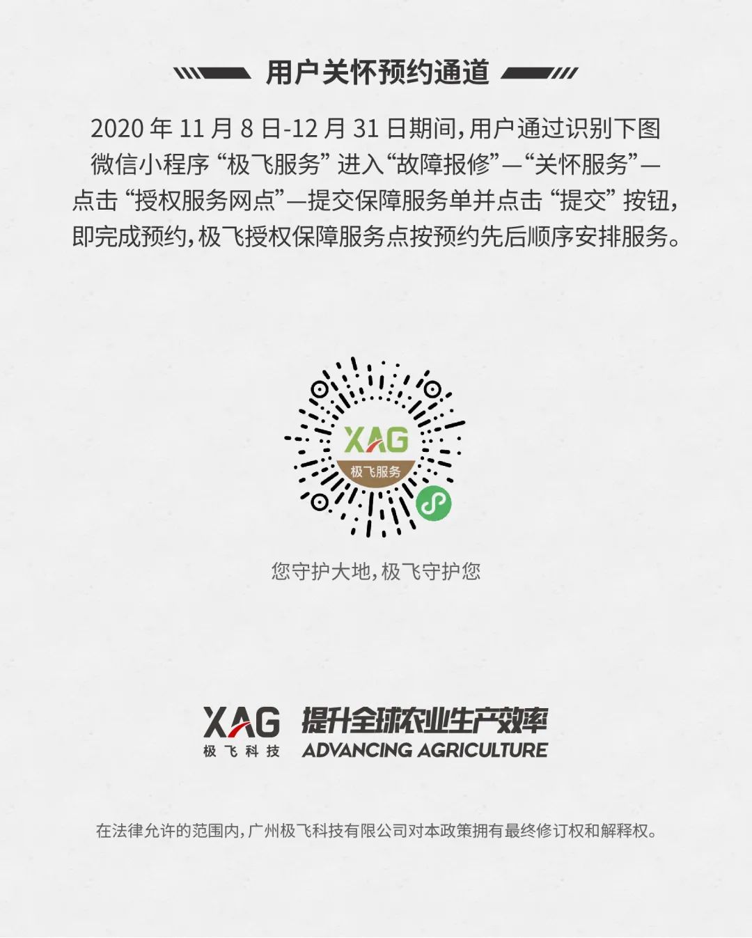 为保障极飞用户来年放心飞行、安心作业,在寒冬来临之际,极飞科技正式推出“用户关怀服务”,用实际行动为全国极飞用户送上冬天里的第一份关怀!