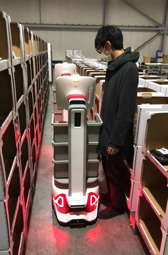 以拣货AMR为例。机器人收到订单后,会即刻根据各商品所在仓位规划出最优路线,“行走”到相应位置后,提示该片区的工作人员将商品放入料箱,再移动至下个拣货点,直到整单拣选完成并输送至打包台。而且,每趟行程可以拣取多个订单。