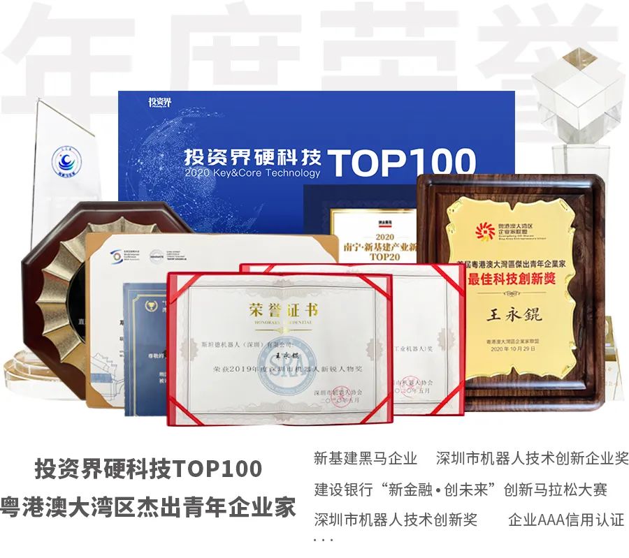 · 投资界硬科技TOP100· 2020年度广东省知识产权示范企业· 新基建黑马企业· AAA级信用企业· 深圳市机器人技术创新企业奖 · 深圳市机器人技术创新奖· 建设银行“新金融·创未来”创赛TOP3· “直通乌镇·全球互联网大会”广州站TOP3 ......