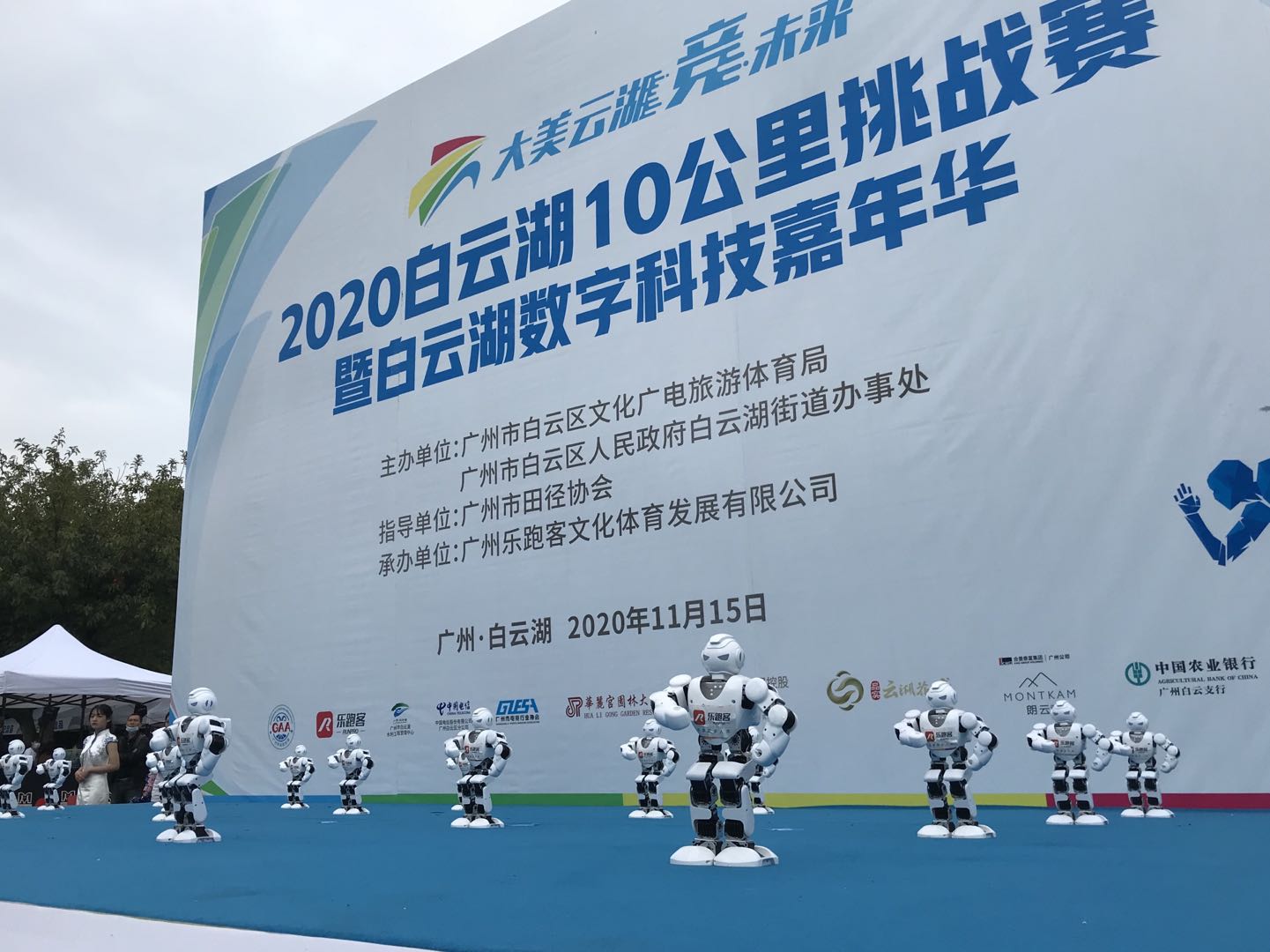 好久不见,甚是想念!今日,热情高涨的跑友们早早欢聚在白云湖公园西门,热身、叙旧。720°VR全景赛道立体展现出白云湖赛道之美,使人眼前一亮。热身环节,一群人工智能机器人闪亮登场,用一套极具科技感的“热身”动作让全场一起摇摆。赛事鸣枪环节,无人机编队相继腾空而起,随着一声令响,无人机在空中变换队形并拉起彩烟,为选手们炫酷领跑。