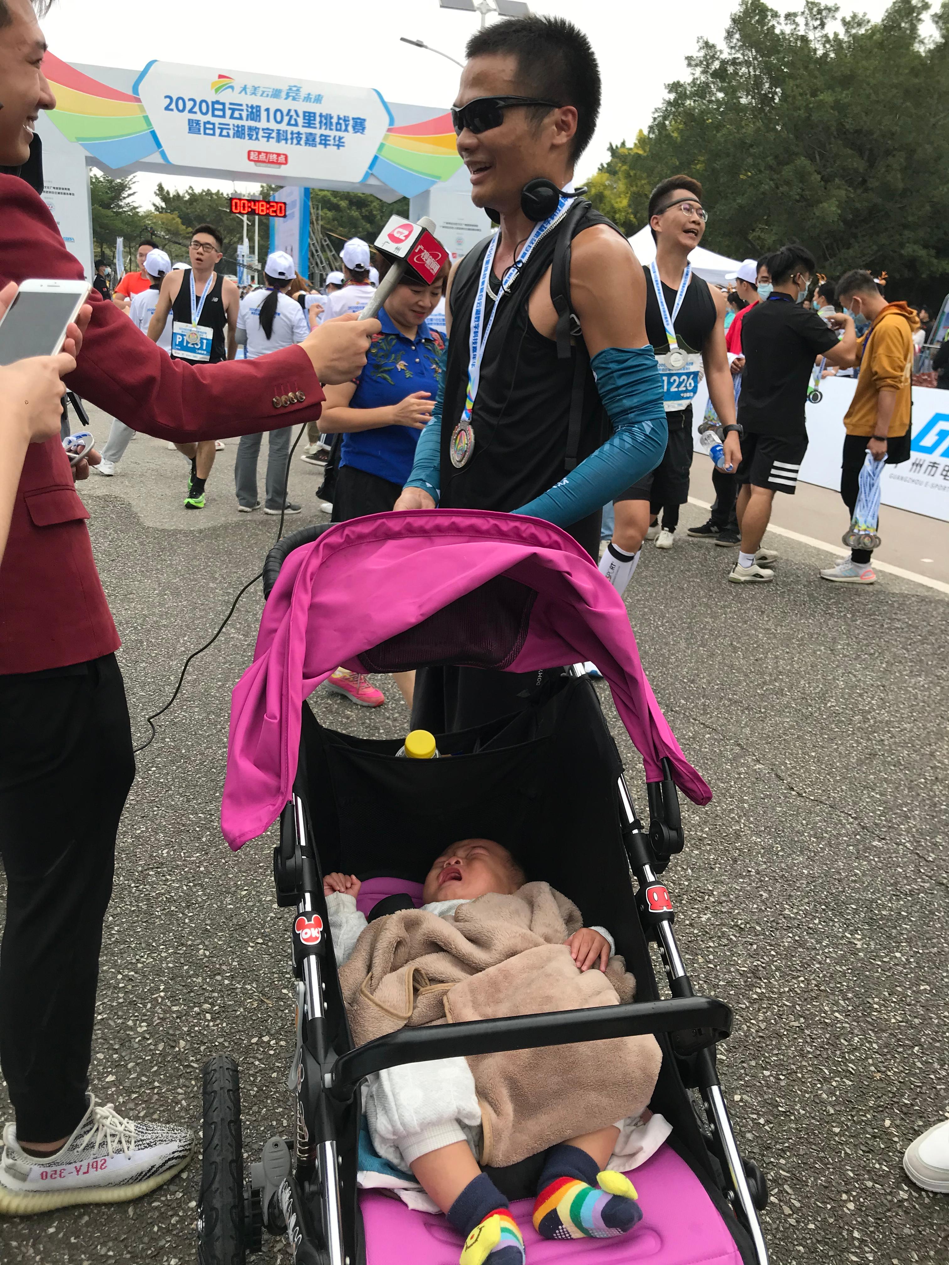 △参赛者陶奕成推着婴儿车跑完全程