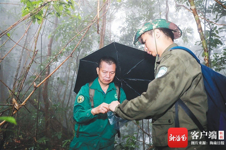 11月14日,海南长臂猿调查队队员冒雨开展调查。海南日报记者 李天平 摄“台风天气期间,我们发现不少猿群出现鸣叫异常的情况,一些群体集体噤声,一些延迟鸣叫时间,一些则减少了鸣叫次数,这可能是猿群对特殊环境的应激反应。”海南国家公园研究院博士马子驭坦言,目前尚不明确雨天与猿群鸣叫之间的关系,“这是一个很有意思的现象,值得我们继续观察研究。”“往年的海南长臂猿调查几乎都在10月底开展,今年受台风影响,调查活动推迟至11月,恰好撞上了雨季和旱季的交替期。”刘国琪表示,包括调查期间也遇到了晴雨天的转变,这刚好为他们提供了一个在不同气候条件下观察海南长臂猿行为模式的机会。本次调查中,最引人关注的莫过于今年8月刚刚喜添新丁的海南长臂猿第5个家族群(E群)。经过连续几天的监测,调查队员发现这个“三口之家”并无异常,这让海南国家公园研究院“海南长臂猿保护研究”项目的“海南长臂猿繁殖生物学研究”课题负责人周江感到欣慰不已。