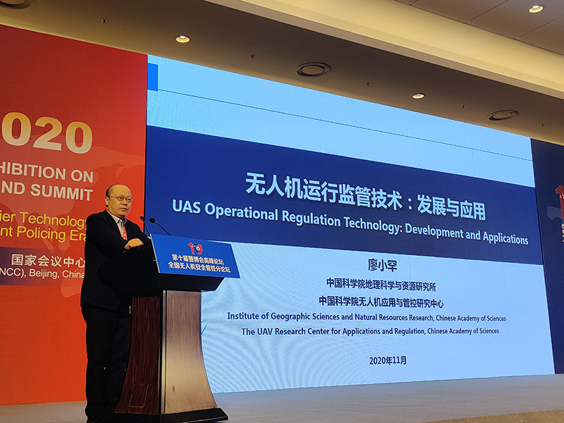 中国科学院地理科学与资源研究所党委书记、中国科学院无人机应用与管控研究中心主任廖小罕进行了“无人机运行监管技术发展与应用”主题发言。