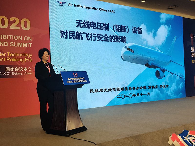 中国民用航空局无线电管理委员会办公室主任万美贞进行了“无人机反制设备对民航飞行安全的影响及应对措施”主题发言。