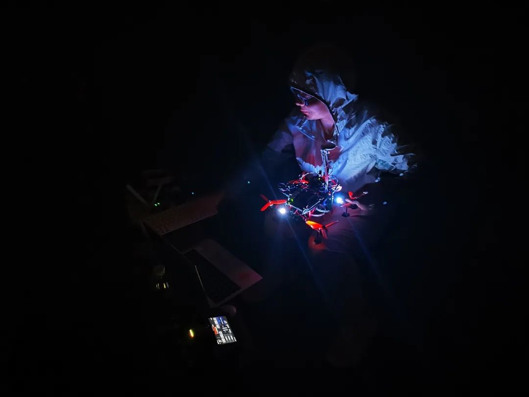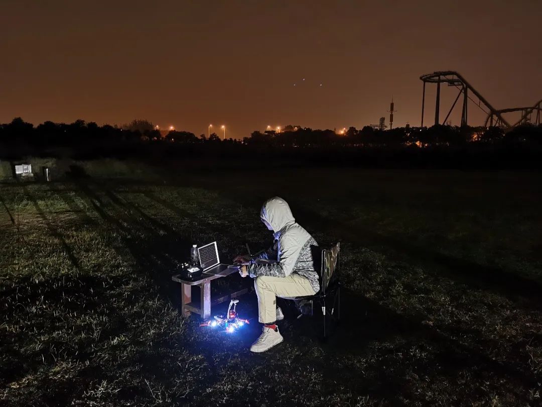 正在外场做夜间飞行测试、包裹得严严实实的王亮(2020年9月16日 摄,地点:上海市松江区玄风航空飞行营地)