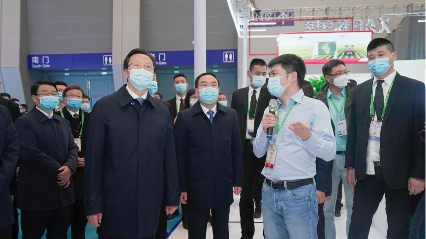 农村农业部部长韩长赋及各领导参观极飞科技主展厅,极飞创始人彭斌介绍极飞智慧农业生态系统如何赋能无人化农场。农业农村部种植业司长潘文博详细听了极飞六大产品线的介绍,并对极飞科技表示了极大的认可。