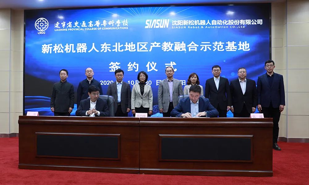 ▲张进副总裁与王彤校长共同签署辽宁交专-新松合作共建“新松机器人东北地区产教融合示范基地”协议
