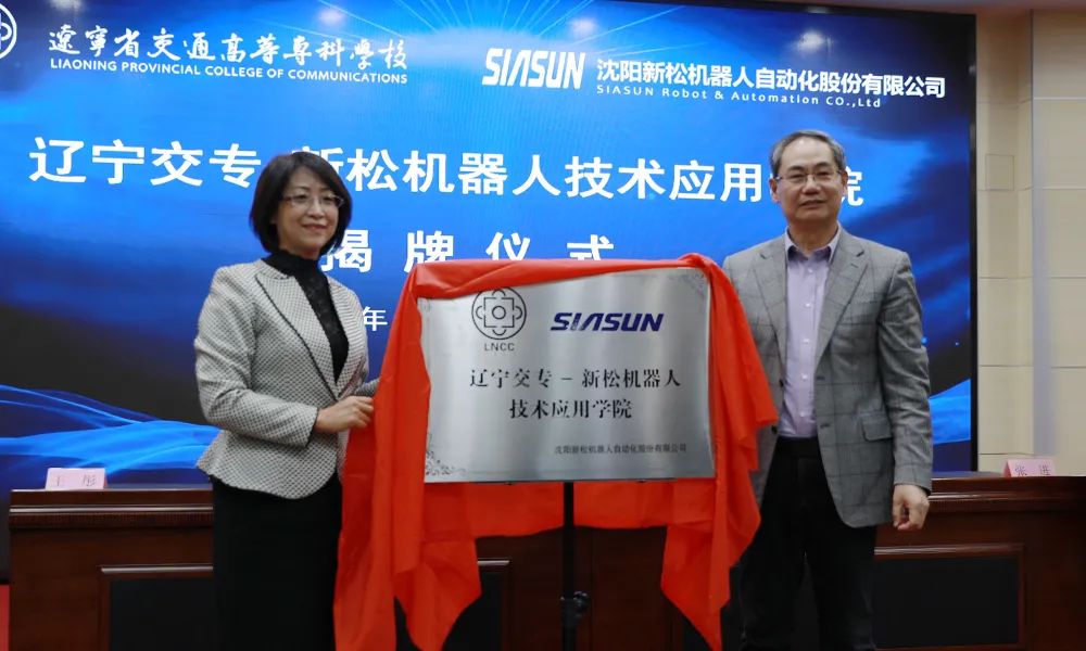 ▲花蕾副厅长和曲道奎总裁共同为“辽宁交专-新松机器人技术应用学院”揭牌