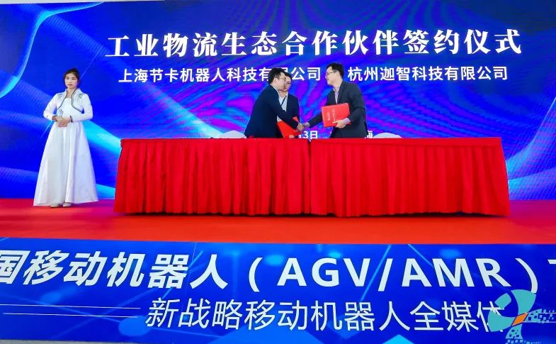 △在迦智科技创始人熊蓉和CMR产业联盟执行秘书长、新战略机器人产业研究所所长李进科的共同见证下,迦智科技总经理陈首先和节卡机器人CTO许雄代表双方企业签署了战略协议;