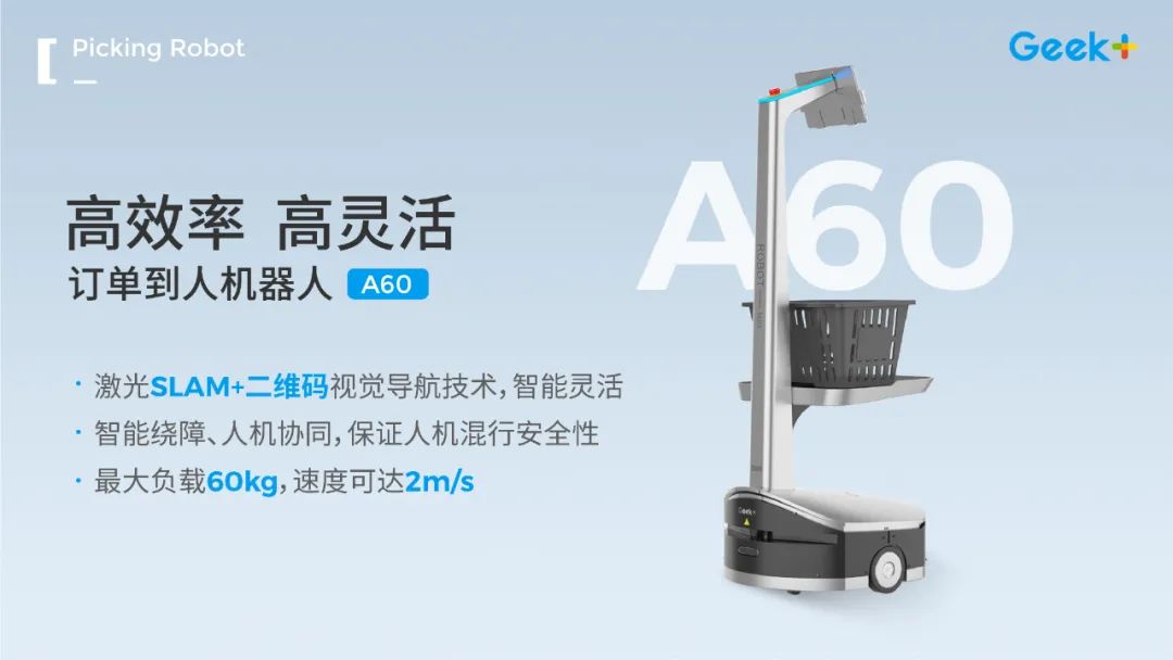 除AislePick订单到人拣选方案,此次CeMAT物流展极智嘉还重磅推出A系列首款机器人A60,该机器人具有高效率、高灵活性等特点,最大负载60kg。极智嘉A60订单到人拣选机器人配载激光SLAM和二维码视觉导航技术,满足几乎所有工业、仓库场景实时变化的场景需求。同时,智能绕障、人机协同等技术确保人机混行的安全性。