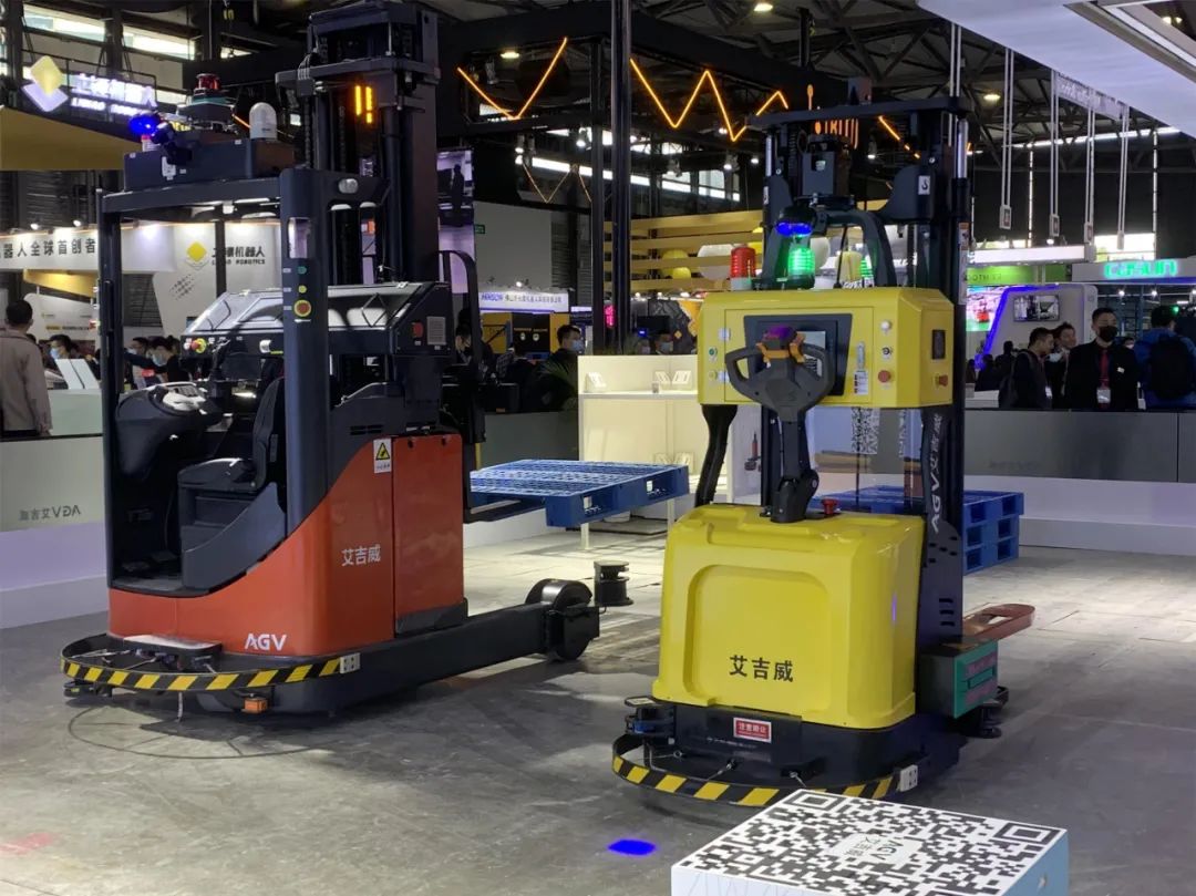 展会现场视频“2吨+10米 高位堆垛前移无人叉车”艾吉威展台现场,展示的高位前移叉车AGV,该车型载重2000kg,最大堆高高度10m,展示的堆码托盘还原该车型精准堆垛搬运场景。此款叉车AGV已成功应用在某奶制品龙头企业生产工序中,属奶粉干混/湿混工序上的智慧物流,叉车AGV与制造执行系统MES、仓库控制系统WMS等多系统对接,跨楼层之间的物料传输,实现整场对车、货、人的全程可追溯管控、高效供应链管理和精益生产。