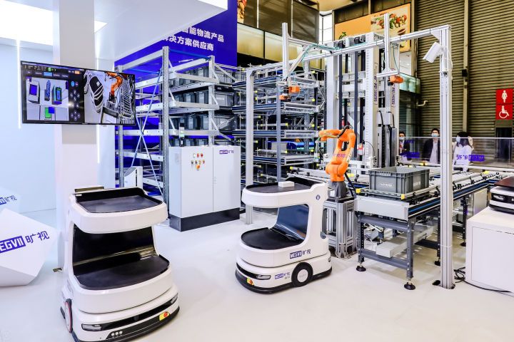 旷视CeMAT展台:箱式四向穿梭车密集存储+货到机器人拣选+AMR搬运解决方案