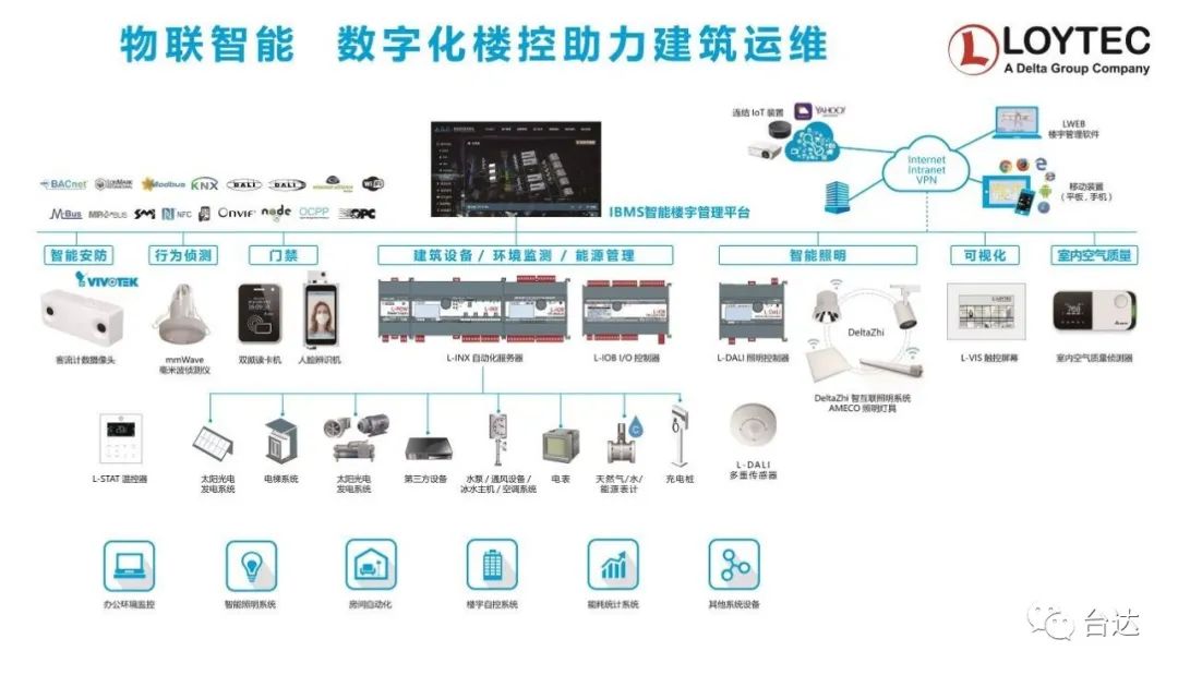 台达-中达电通智能楼宇事业处产品总监赵国超表示:台达的楼控方案将健康+智慧建筑做为未来发展的两大方向。从智能建筑向智慧建筑的转变,台达已将物联网、边缘计算、传感等技术引入到方案中来,台达打造的全网络IoT楼宇自控系统,将建筑设备管理、智能安防、行为监测、门禁、智能照明、空气质量监测、能源管理等集成于同一智能楼宇管理平台,平台支持各类通信协议,可完全打通不同设备、系统间的数据交互,通过强大的数据计算及处理能力,为本地/远程管理者提供可视化分析,助力楼宇实现数字化运维。
